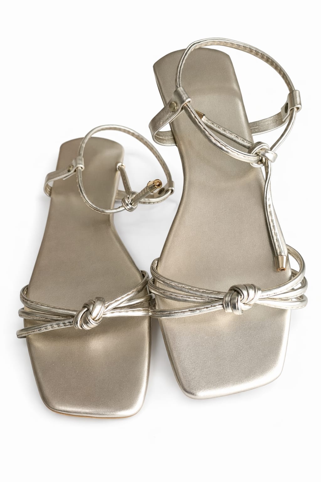Sandália dourada com design moderno e delicado. Os detalhes em nós trazem charme e sofisticação, perfeita para iluminar seus looks com leveza e estilo.