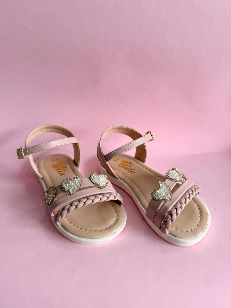 Este modelo une texturas e brilhos de forma única para um visual romântico e moderno. Com três corações cravejados de pedraria que captam a luz e uma delicada tira trançada, esta sandália é a escolha perfeita para quem busca um calçado que seja, ao mesmo tempo, um acessório de destaque no look.